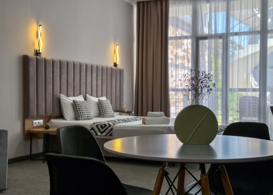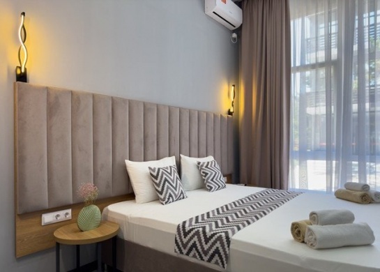 Интерьер отеля выполнен в скандинавском стиле, который зародился в 30-50-х годах в странах Северной Европы, но при этом прекрасно подходит для отелей, расположенных в прибрежной зоне Абхазии. Скандинавский стиль – это не просто направление, а во многом образ жизни или философия, которая должна резонировать со взглядами и мироощущением наших постояльцев.Этот стиль выбирают люди, стремящиеся к жизни в гармонии с собой, окружающими и природой. Как правило, у них развито чувство собственного достоинства, определяющее их уважение и к миру в целом, к каждому человеку. А уважение к себе проявляется в выборе лучшего для своей семьи. Именно поэтому мы предусмотрели использование в отеле лучших отделочных материалов, лучшей мебели, лучших практических решений, чтобы сделать отдых наших гостей проще. Наша философия - это уважение и забота о природе – и это, конечно, про использование (и использование рациональное) натуральных материалов, про осознанное потребление и покупку мебели и предметов интерьера у эко-френдли производителей, чего мы и придерживались в концепции нашего отеля. Цветовая палитра отеля выражена в традиционных скандинавских оттенках, в интерьере преобладают простые тона: белый, бежевый, зеленый, серый, которые создают атмосферу легкости и свежести. Но иногда их обыгрывают яркие предметы декора и плетеной мебели. Стиль «сканди» как нельзя лучше подходит для людей, которые часто путешествуют и любят приключения.